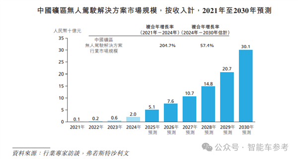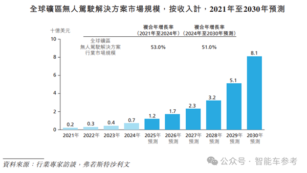 根据弗若斯特沙利文数据估计,矿区无人驾驶解决方案的中国市场,在2024年收入约为20亿元,预计到2030年将达301亿元,复合年增长率达57.4%。
